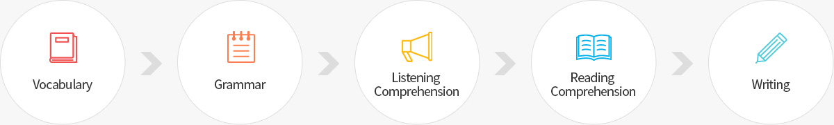 각 영역의 각 레벨은 7문항을 제공하며 5문항 이상 맞는 경우, 다음 레벨로 자동 이동됩니다.