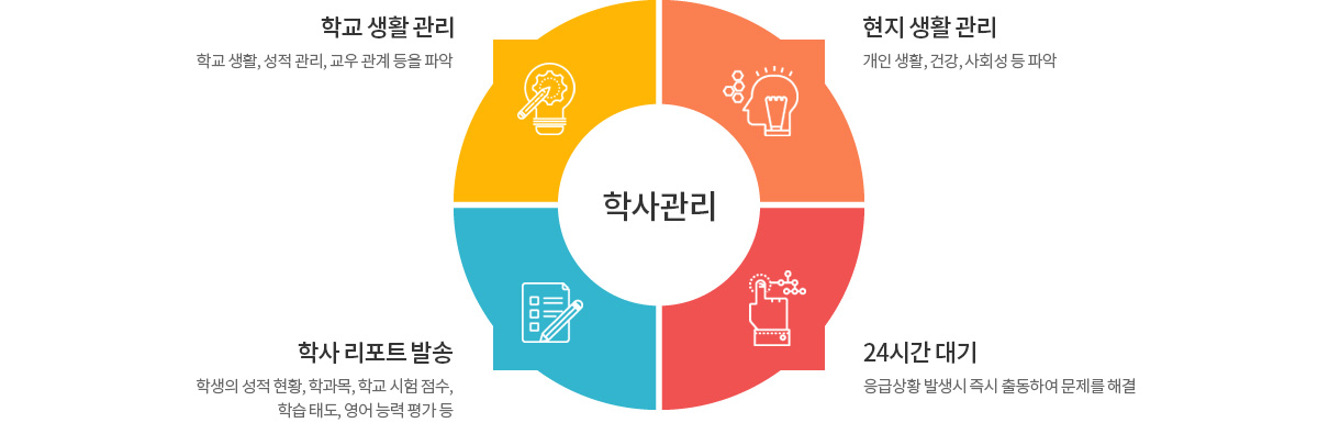 지역마다 교육 전문가(홈스테이 관리자, 학사관리자)들을 배치하여 학생의 입학부터 졸업 동안 학교생활, 방과 후 활동 등 학생의 생활적인 부분과 학습적인 부분을 최선을 다해 관리하는