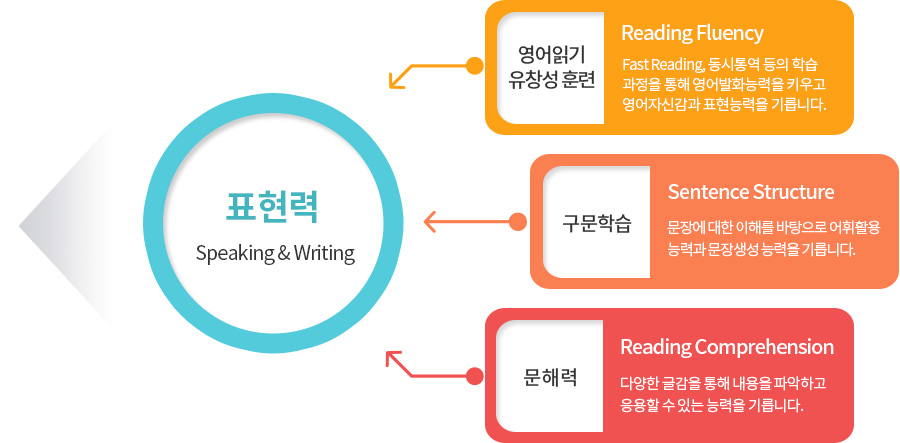 문장의 구조와 어순감각을 습득하여 문장생성능력을 향상시킴으로써 외워서 말하는 단순한 상황회화를 넘어서 의사소통을 위한 진정한 영어표현능력을 배양합니다.